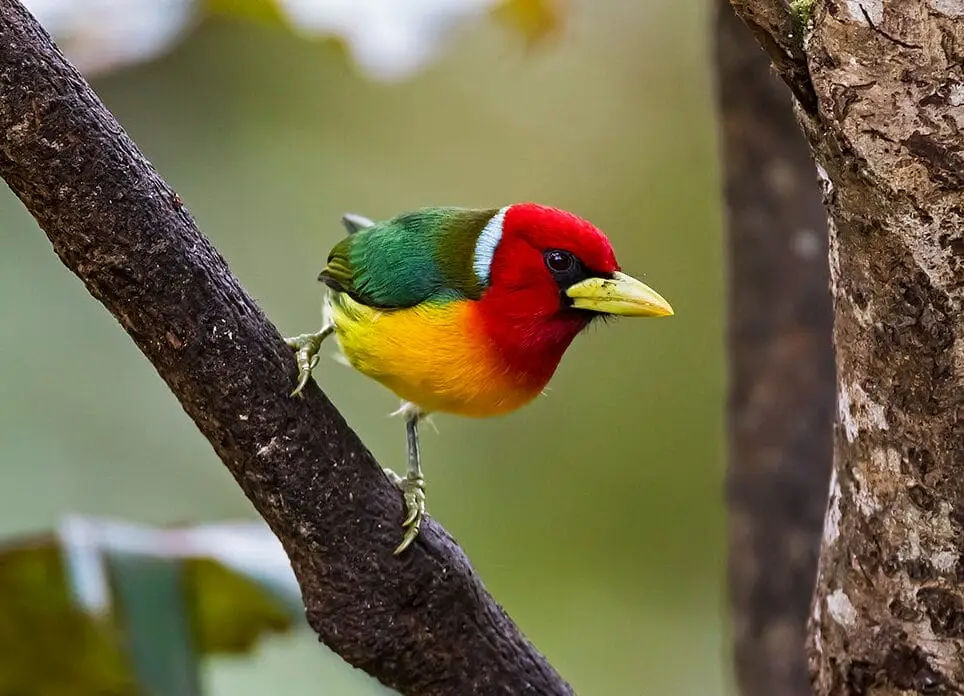 Barbudo Cabecirrojo (Eubucco bourcierii): Este pájaro de vistoso plumaje rojo y verde es fácil de observar en varios santuarios de vida silvestre de Colombia.